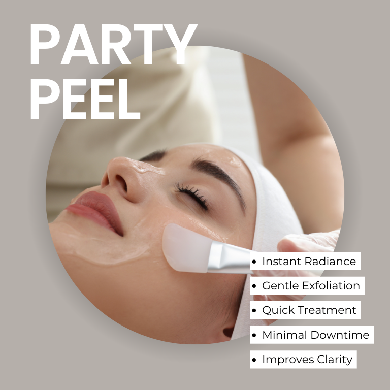 Party Peel is a gentle chemical peel designed to exfoliate and revitalize your skin, providing immediate radiance and smoothness. It’s perfect for achieving a glowing complexion before special events.
